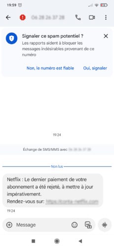 De eerste maand van het jaar is net voorbij. Oplichters profiteren hiervan om hun gebruikelijke phishingcampagnes te lanceren. In dit geval ontving een redactielid een nogal banaal uitziende sms. Zoals je kunt zien op de schermafbeelding hieronder, staat er: “Netflix: De laatste betaling voor uw abonnement is geweigerd, gelieve bij te werken”. Vervolgens wordt je uitgenodigd om naar een link te gaan om de situatie te regulariseren.